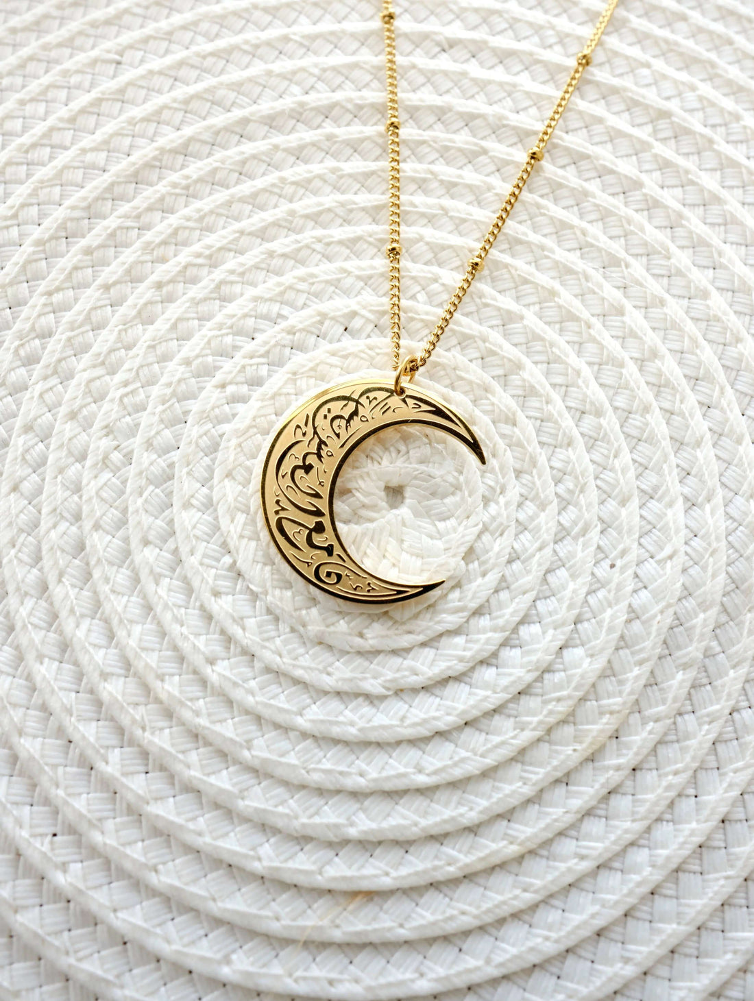 Introducing the Nur Al Qamar necklace, a crescent moon pendant intricately engraved with the empowering...